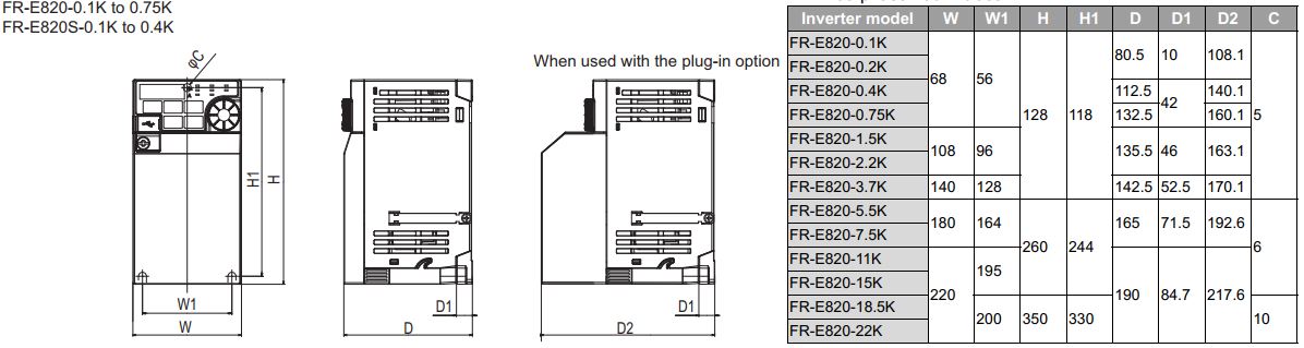 3. Kích thước biến tần Mitsubishi FR-E820-0.75K-1
